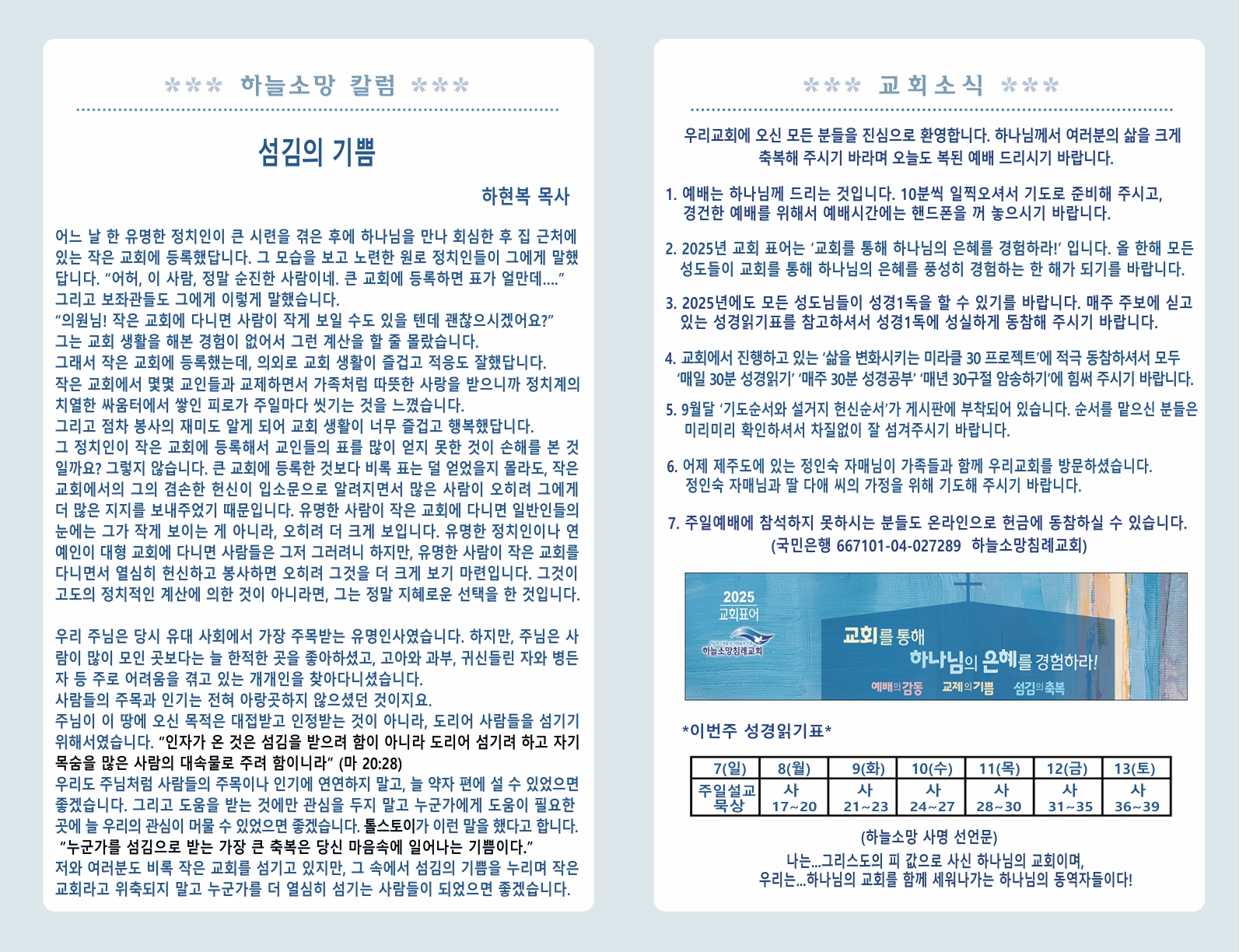 | 다음글 | 2025년 9월 7일 교회소식 | 운영자 | 2025.09.05 | 3 | 261 |
