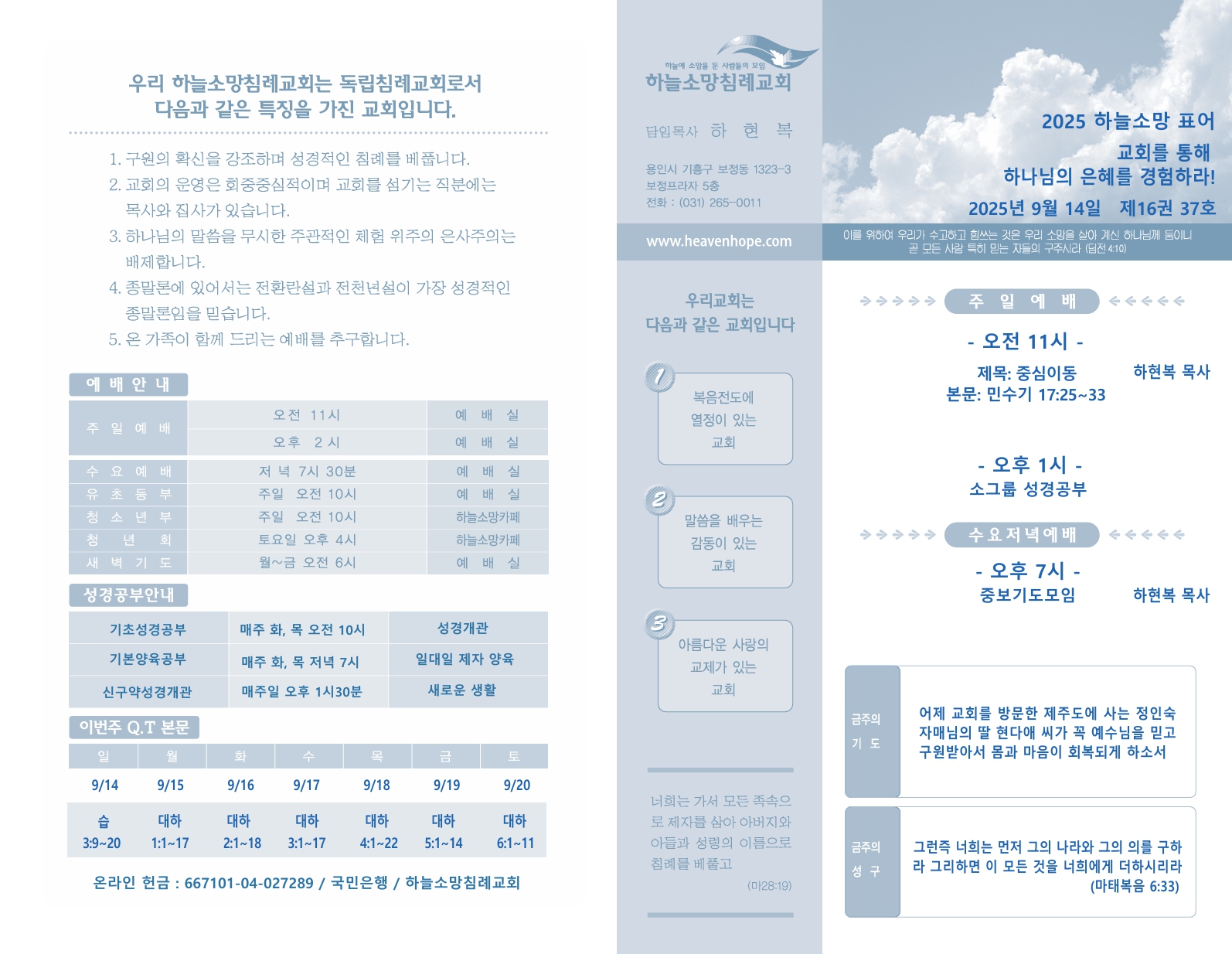 | 이전글 | 2025년 9월 21일 교회소식 | 운영자 | 2025.09.19 | 0 | 419 |