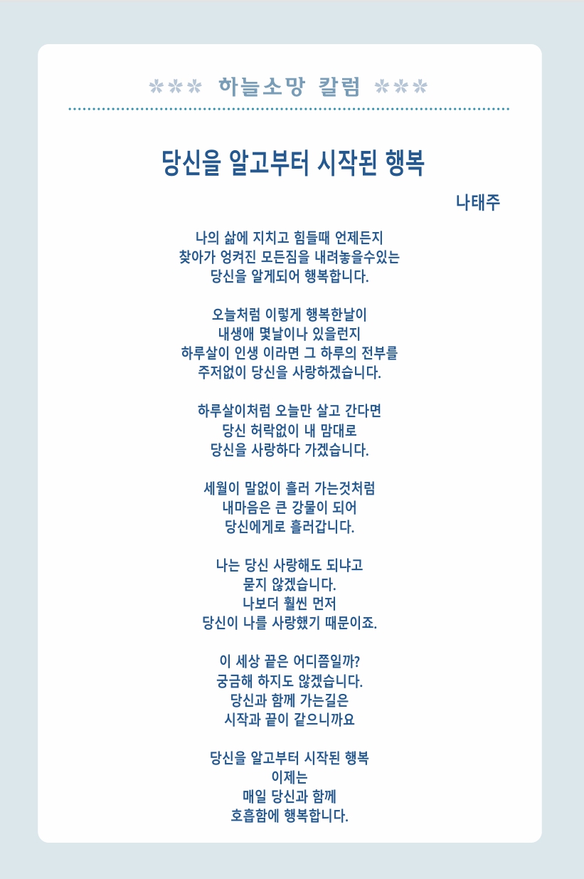 | 이전글 | 듣고 싶은 말과 들어야 할 말 | 운영자 | 2025.08.29 | 0 | 195 |