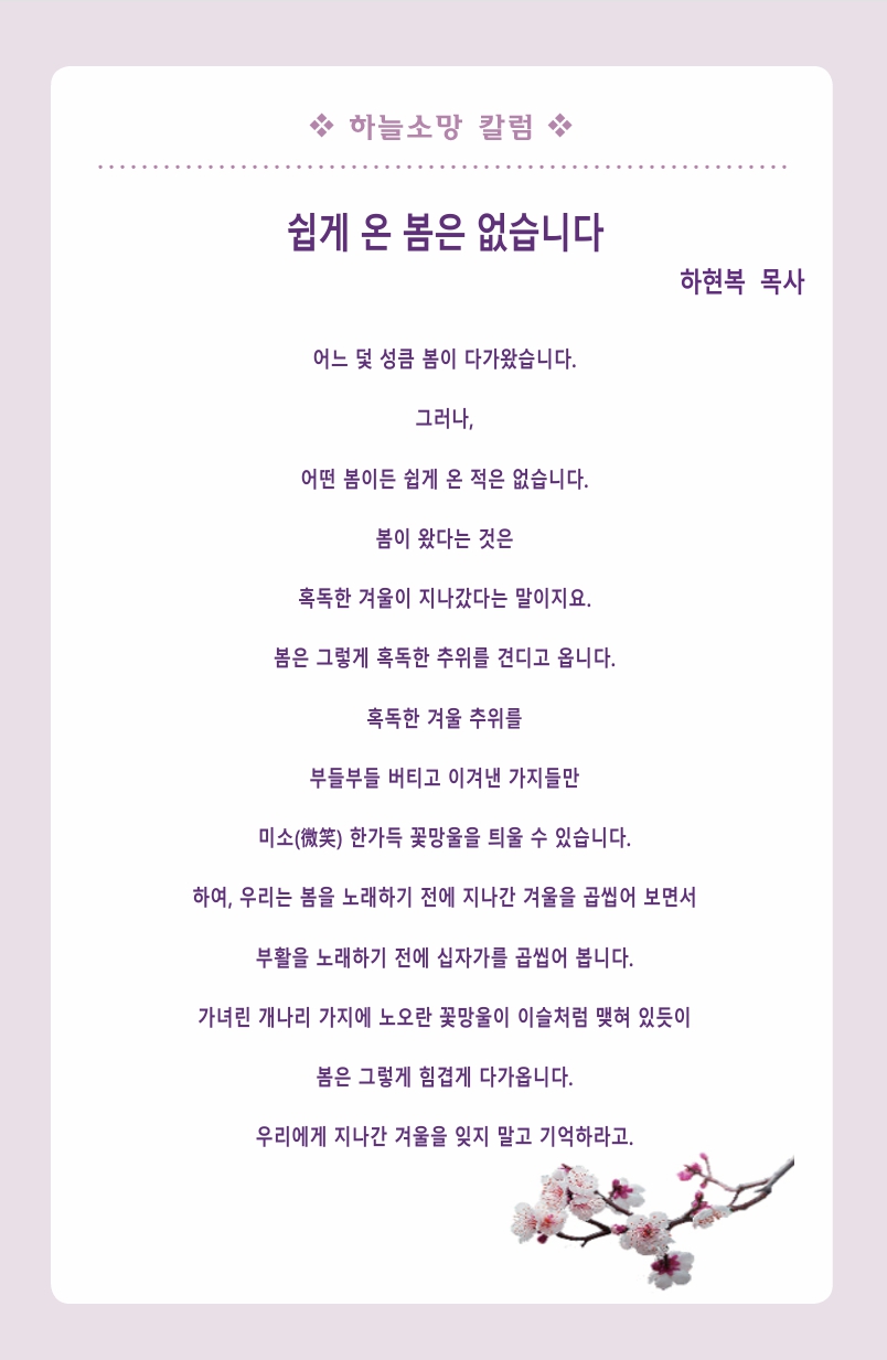 쉽게 온 봄은 없습니다 운영자 2026-04-11 추천 0 댓글 0 조회 10 http://www.heavenhope.com/bbs/bbsView/71/6624685 첨부파일 (0) 0